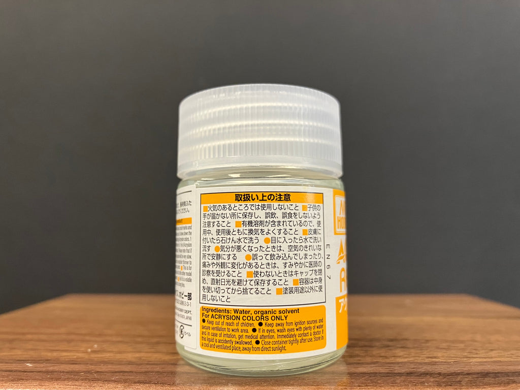 Caution: Acrysion and Acrysion-related paints and finishing materials, such as Acrysion solvent and Acrysion tool cleaner, cannot be used for mixing, diluting, or cleaning with Aqueous Hobby Color, Mr. Color, or other water-based paints. Please be careful.