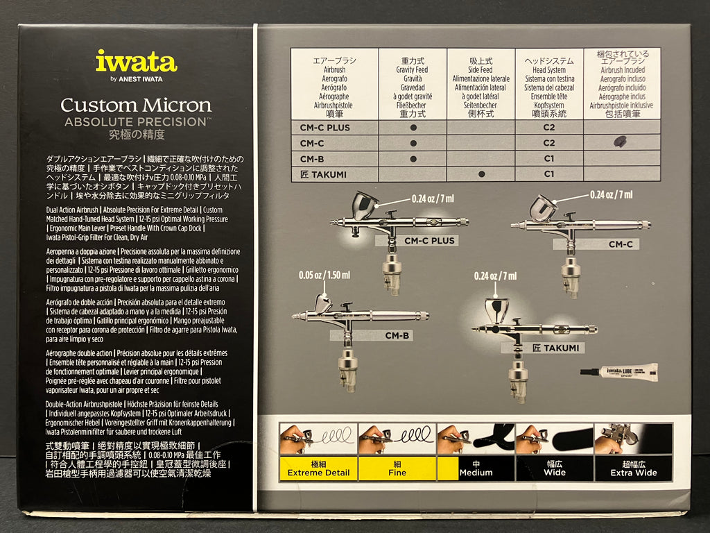 Experienced airbrush users who demand absolute precision choose Iwata Custom Micron Series airbrushes for extreme detail spraying. What makes Custom Micron special is that every head system is custom matched and hand-tuned to meet Iwata's rigorous performance standards for superior atomization. Replacement Head Systems are tested and tuned to the same standards to ensure that Custom Micron will maintain its precision over time.
