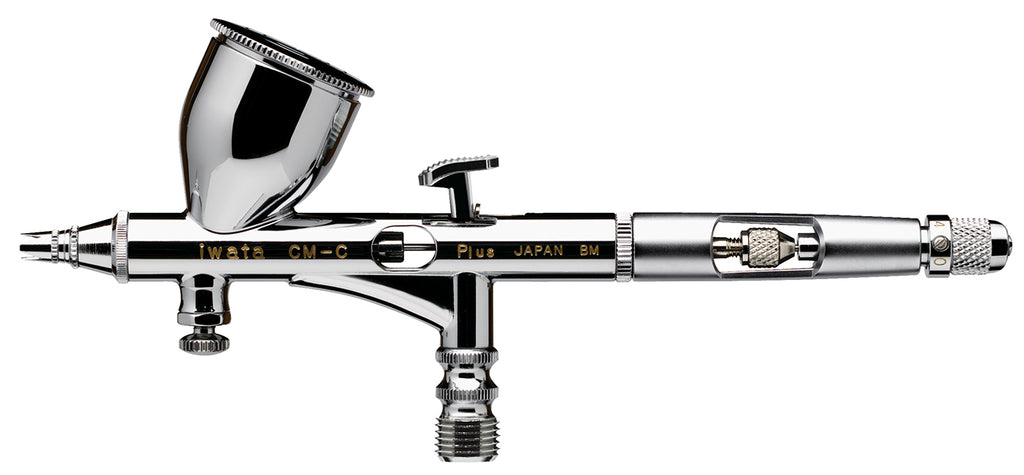 Iwata Custom Micron CM-C Gravity Feed Dual Action airbrush features a 0.24 oz / 7 ml fluid cup with lid that is ideal for color mixing. The ergonomic main lever is comfortable to use and the preset handle allows you to set the spray output, which increases your control while reducing finger fatigue. Iwata's spring-steel needle resists breakage and our needle packings are solvent resistant for longevity. If you like to remove the crown cap, you will appreciate micron's crown cap dock, which stows the cap when not in use.
