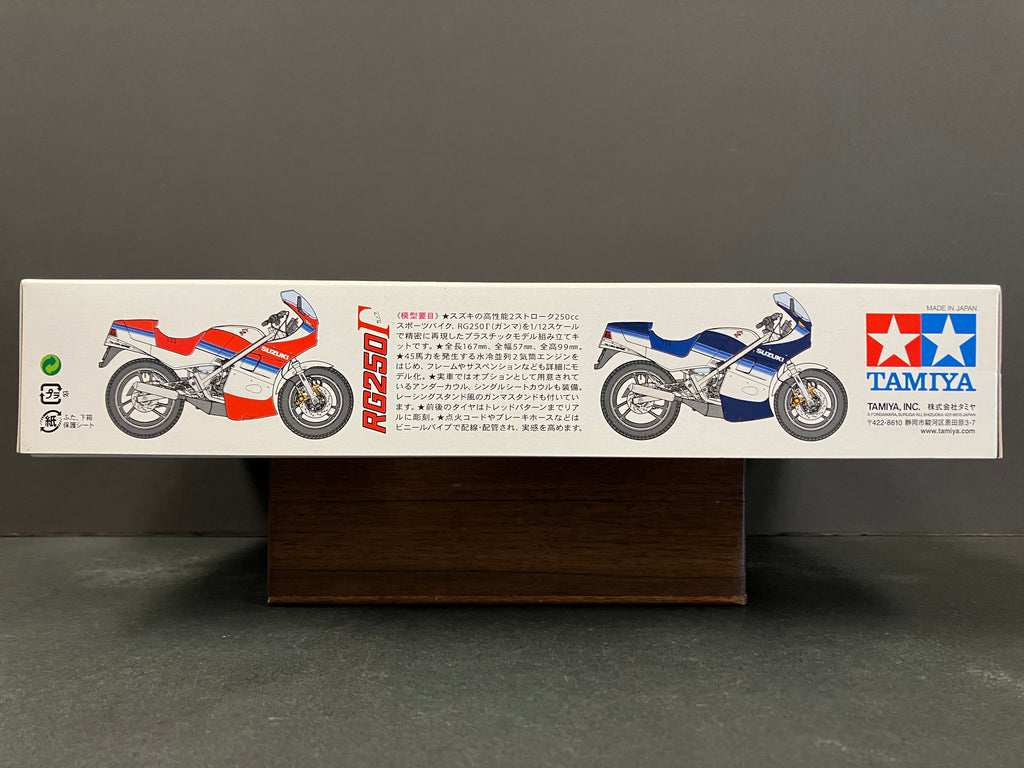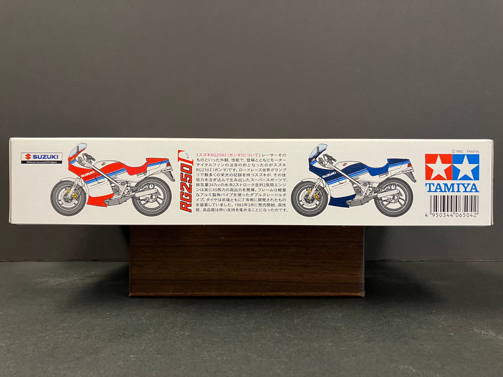 This is a plastic model kit of the Suzuki RG250Γ (Gamma), a motorcycle that captured the attention of motorcycle enthusiasts upon its release in March 1983, with its race-inspired appearance and performance.