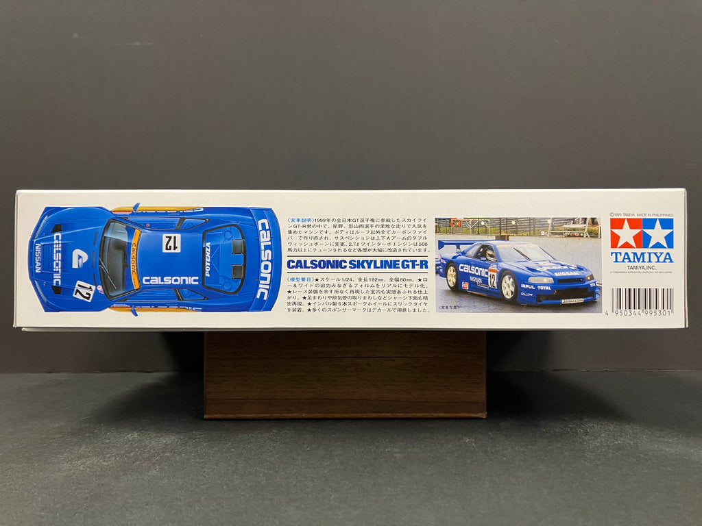 This plastic model assembly kit is based on the Calsonic Skyline GT-R, which was popular among the Skyline GT-Rs that competed in the 1999 All Japan GT Championship, thanks to the bold driving of drivers K. Hoshino and M. Kageyama.