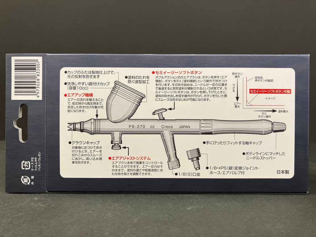 This is the ultimate precision airbrush, featuring a 0.2 mm nozzle, a semi-easy soft button, an air adjustment system, and an air-up mechanism to stabilize air pressure.