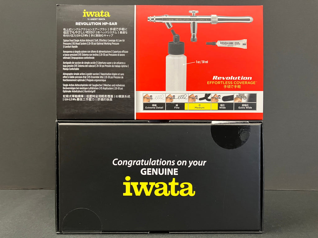 Iwata Revolution HP-SAR Siphon Feed Single Action airbrush features a comfort handle and the single action delivery is easy-to-use, especially for beginners. One of the benefits to siphon feed is the ability to use multiple bottles that can hold larger volumes of spray material, as compared to gravity-feed airbrushes. Iwata Revolution HP-SAR Siphon Feed Single Action airbrush includes a 1 oz / 30 ml bottle. Additional bottles may be purchased and prefilled with your favorite colors. (Sold separately).