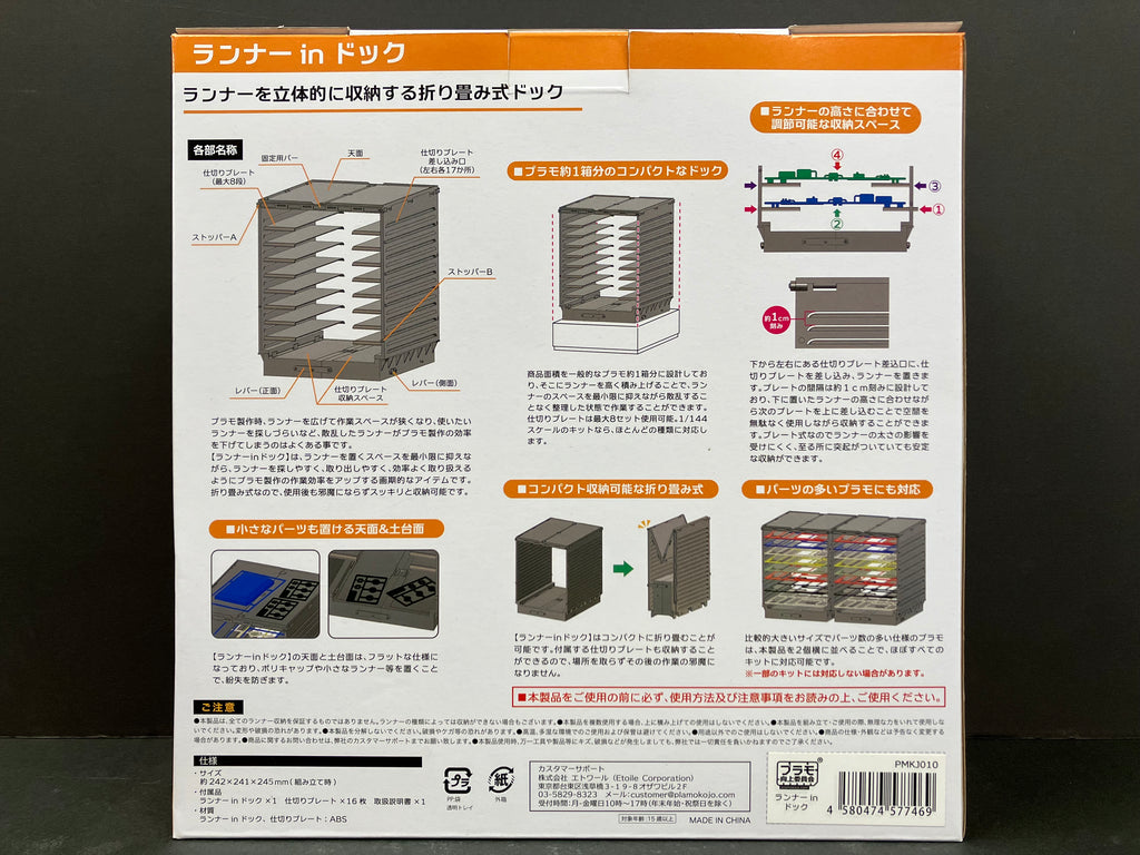 The Runner-in-Dock is an innovative item that minimizes the space required to store runners, making them easier to find and retrieve, and handling them more efficiently, improving the efficiency of your plastic model building.