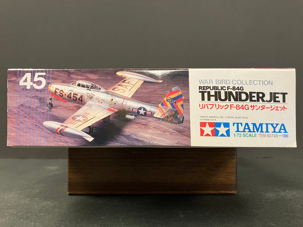 This is a plastic model kit of the F-84G Thunderjet, a fighter-bomber that appeared in the early 1950s and saw action as a ground attack aircraft during the Korean War.